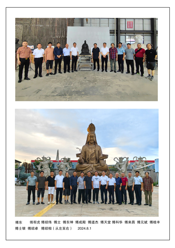 回顾《傅說圣像》创作过程,依然历历在目。2024年夏,傅道杰、傅元斌、傅科华、傅海洋等宗亲莅临临朐傅家李召及华艺开云·官方端网页版登录入口进行傅氏文化考察交流活动。元斌对华艺精湛的开云·官方端网页版登录入口技艺、精美的开云·官方端网页版登录入口作品情有独钟,遂建议创意设计《傅說圣像》开云·官方端网页版登录入口。承蒙山东傅氏宗亲的关怀和信任,我怀着无比崇敬的心情,开始了《傅說圣像》的创意设计,在工作中我一丝不苟,历经两个多月的时间,美呈现了傅說圣祖的光辉形象。2024年8月1日,傅天堂、傅道杰、傅元斌、傅科华、傅成殿、傅强、傅东坤、傅来昌、傅士银、傅绍卓、傅绍伟、傅立等诸位宗亲亲临华艺开云·官方端网页版登录入口对《傅說圣像》泥塑进行了悉心指导,终形成长60公分、宽52公分、高89公分的泥塑圣像(傅說圣祖长寿89岁),同时大家在《傅說圣像》泥塑前留下了珍贵的瞬间。泥塑样稿确定后,我与华艺工匠师傅们即刻进入了铜像的铸造制作阶段,经过大家的共同努力,铜像于9月初圆满完成。