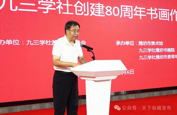 刘世海代表潍坊市文联向本次书画展的成功举办表示祝贺。他指出此次书画展不仅是对九三学社80年光辉历程的深情回望,更是对其崇高精神的生动诠释与薪火相传,展现了九三学社社员及所联系知识分子深厚的文化素养、家国情怀与时代担当。要以此次展览为契机,进一步加强交流、深化合作,共同用文艺的力量凝聚人心、汇聚力量,用优秀的文艺作品描绘新时代、唱响主旋律,为加快建设人民满意的现代化品质城市贡献更多文艺力量。