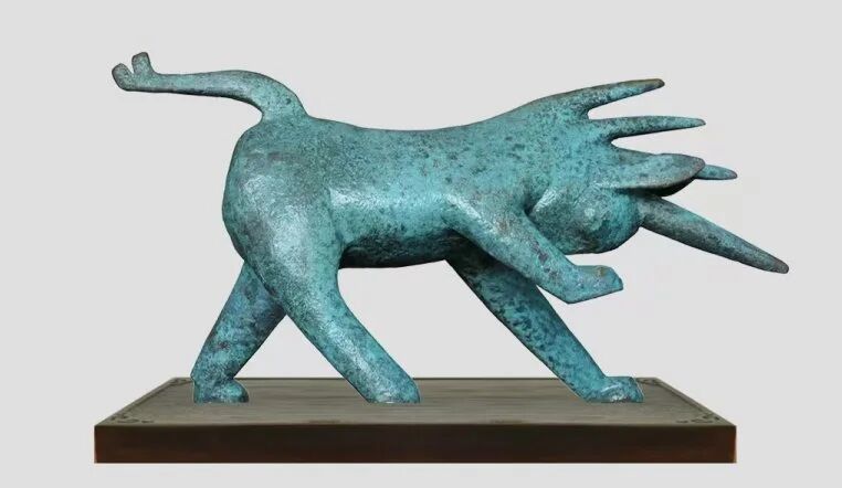 獬豸是中国古代传说中的一种似羊非羊、似牛非牛的神兽,具有分辨是非、判断正误的特异功能。该作品三脚踏地,低首翘尾,锐角前凸,跃跃欲试,除头顶部的主角之外,又将颈背部的鬃毛化作三只尖角,两只长耳亦前刺如矛,突出了獬豸无所畏惧,集全身之力向邪恶冲刺的耿直本性。