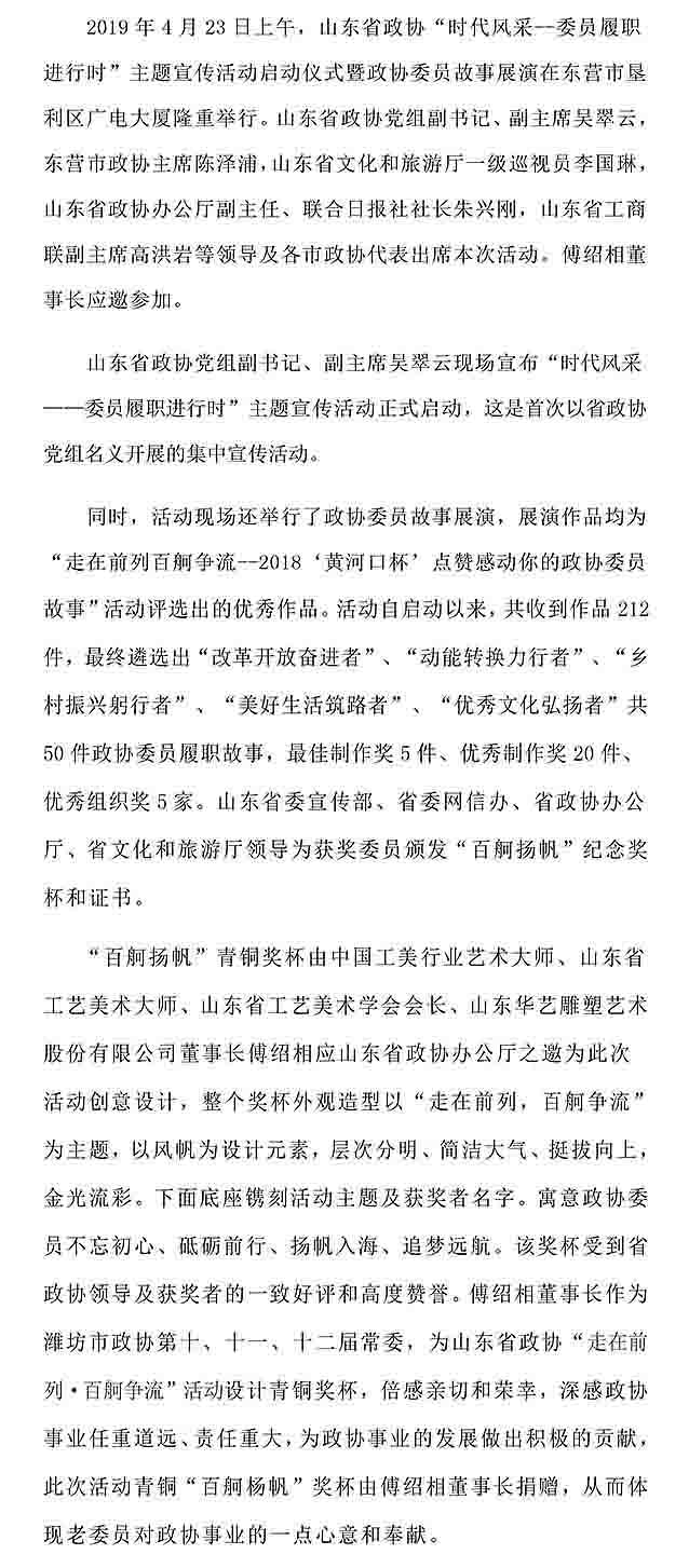 2019年4月23日上午,山东省政协“时代风采--委员履职进行时”主题宣传活动启动仪式暨政协委员故事展演在东营市垦利区广电大厦隆重举行。